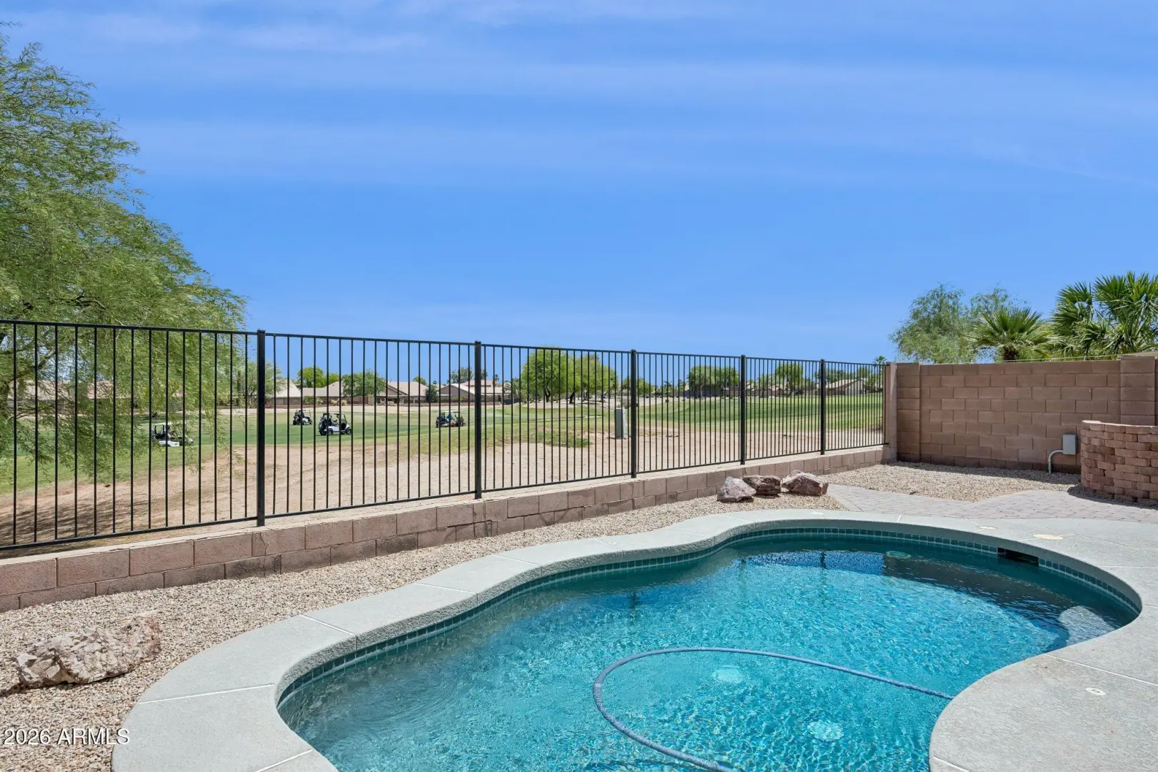 Welcome to your private retreat in the gated golf course community of Johnson Ranch. Situated on a premium lot with stunning golf course views, this 3-bedroom, 2-bath home offers the perfect blend of comfort, functionality, and outdoor living. Step inside to a bright, open layout with a great room concept, updated lighting, and fresh interior paint throughout. The kitchen features stainless steel appliances, a pantry, reverse osmosis system, and flows seamlessly into the main living space, making it ideal for both everyday living and entertaining. The real showstopper is the backyard. Enjoy Arizona living at its finest with a sparkling play pool, above-ground heated spa, paver patio, and covered seating area, all overlooking the golf course. Whether you're hosting guests or unwinding...