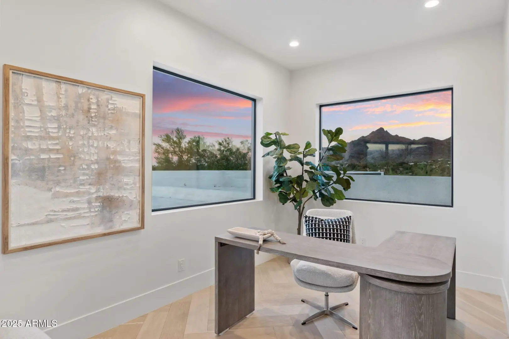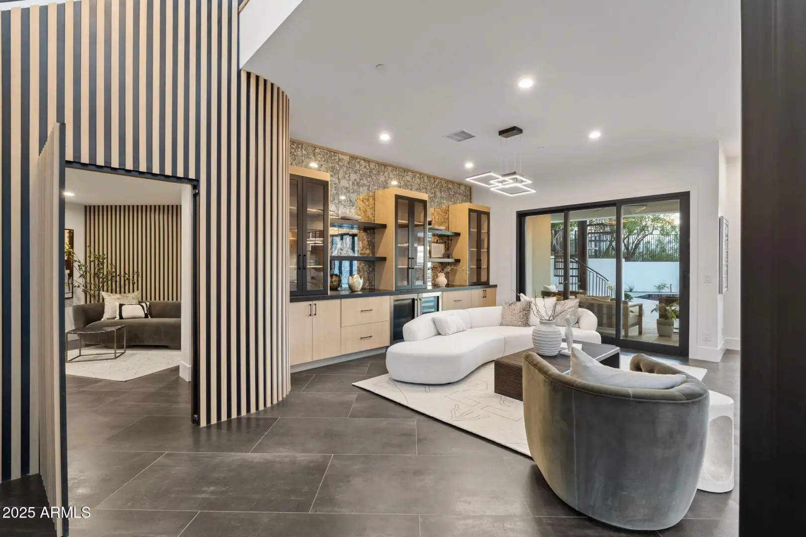 Altura Peak, a striking modern hillside residence set within the coveted Alta Vista enclave near the Biltmore and Paradise Valley. Perched on a private cul-de-sac and spanning over 1.18 acres, this architectural retreat captures sweeping mountain and city-light views while offering exceptional privacy in a premier central location. Designed for seamless indoor-outdoor living, the home features expansive open living spaces with 10-foot high ceilings, walls of glass, and multiple terraces that connect effortlessly to resort-style outdoor living. The chef's kitchen anchors the main living area and flows into generous entertaining spaces overlooking the pool and Valley beyond. A hidden speakeasy with custom bottle storage connects to