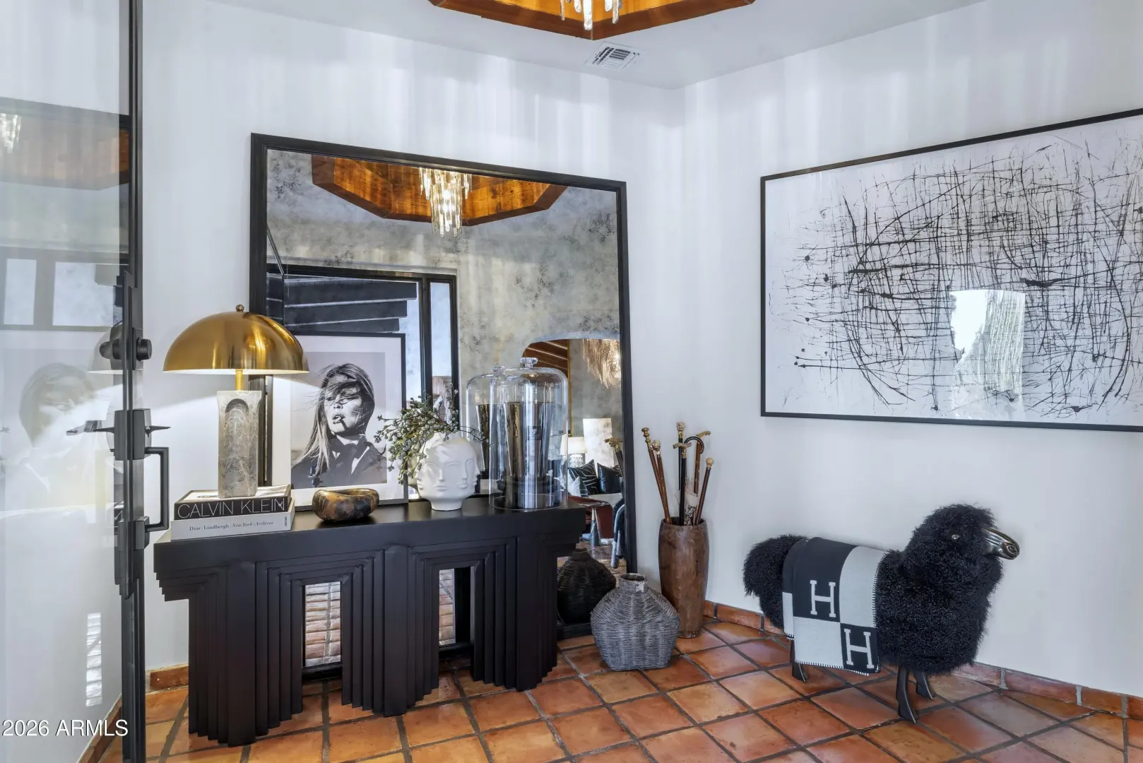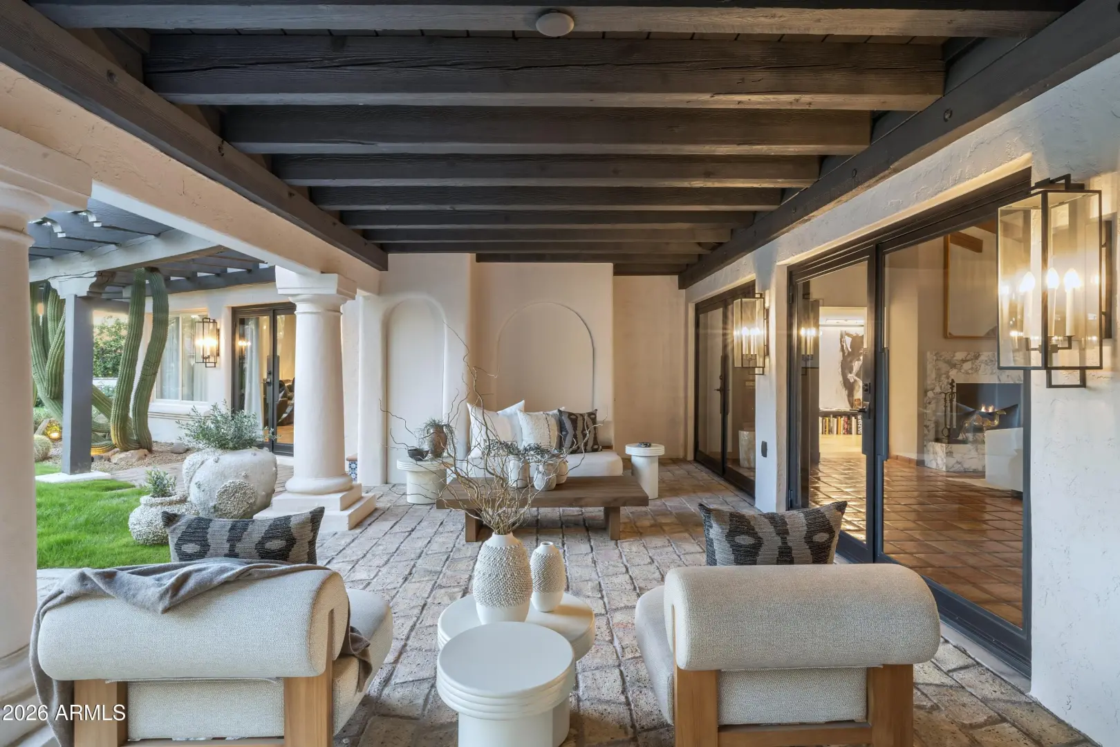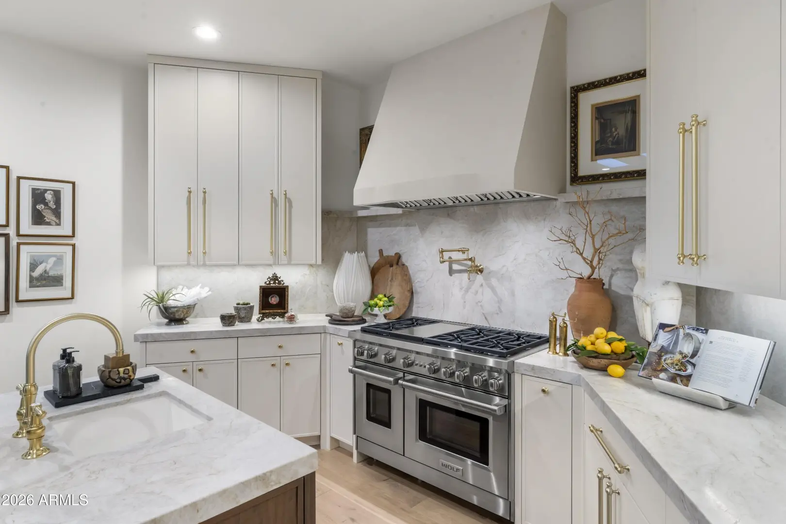 Composed with a curator's eye, Casa de Tesoros layers artisanal materials and tailored moments: bespoke cabinetry wrapped in Taj Mahal quartz, countertops, backsplash, even the window surround, frames a Wolf double range and Sub-Zero refrigeration. Lindzey Lawler of Curated Design underscored the home's central idea: distinction over sameness, craft over trends. Beyond the windows, the backyard reads like a private resort. Its layered and matured landscaping softens the desert edge while framing its lush and uninterrupted golf-course grounds; mountain vistas above. A shimmering pool anchors the composition, catching the afternoon light like cut stone, with generous decking for lounging and alfresco dining. Thoughtful planting palettes of textural greens, sculptural succulents, seasonal