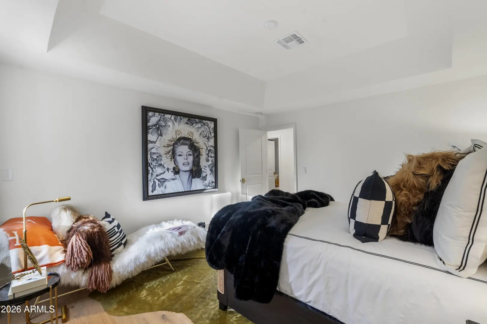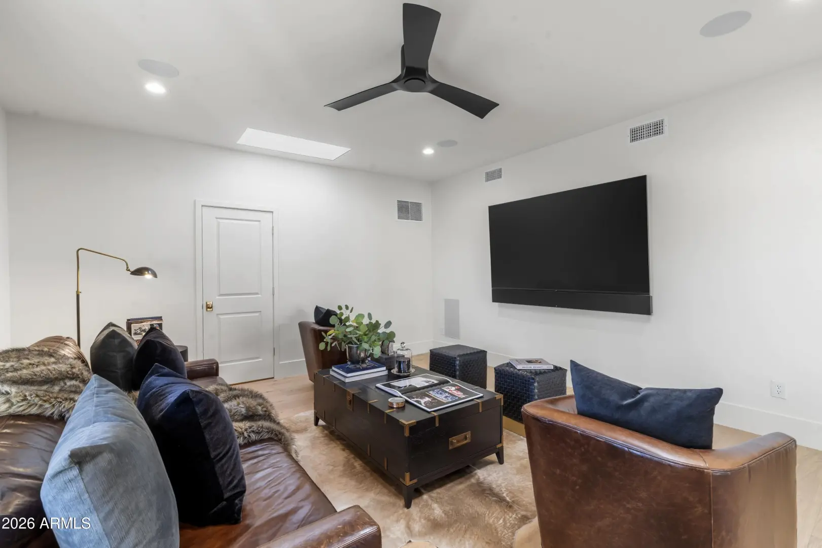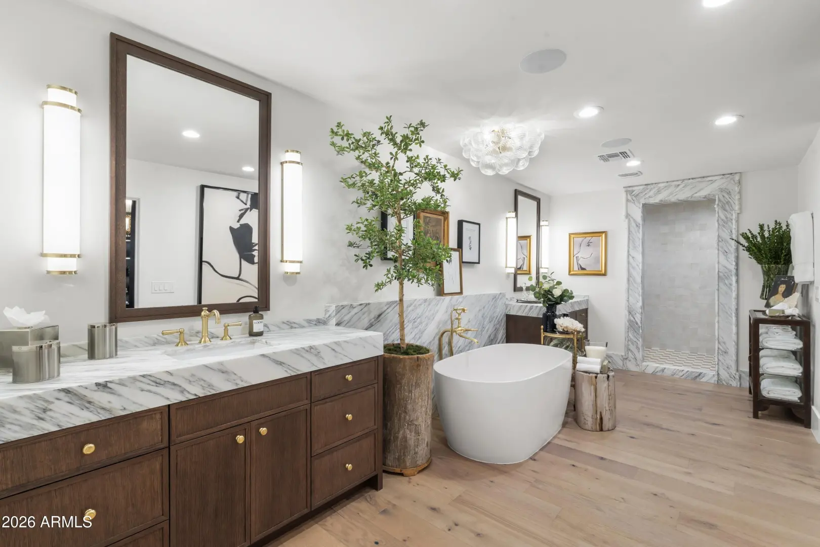 Composed with a curator's eye, Casa de Tesoros layers artisanal materials and tailored moments: bespoke cabinetry wrapped in Taj Mahal quartz, countertops, backsplash, even the window surround, frames a Wolf double range and Sub-Zero refrigeration. Lindzey Lawler of Curated Design underscored the home's central idea: distinction over sameness, craft over trends. Beyond the windows, the backyard reads like a private resort. Its layered and matured landscaping softens the desert edge while framing its lush and uninterrupted golf-course grounds; mountain vistas above. A shimmering pool anchors the composition, catching the afternoon light like cut stone, with generous decking for lounging and alfresco dining. Thoughtful planting palettes of textural greens, sculptural succulents, seasonal